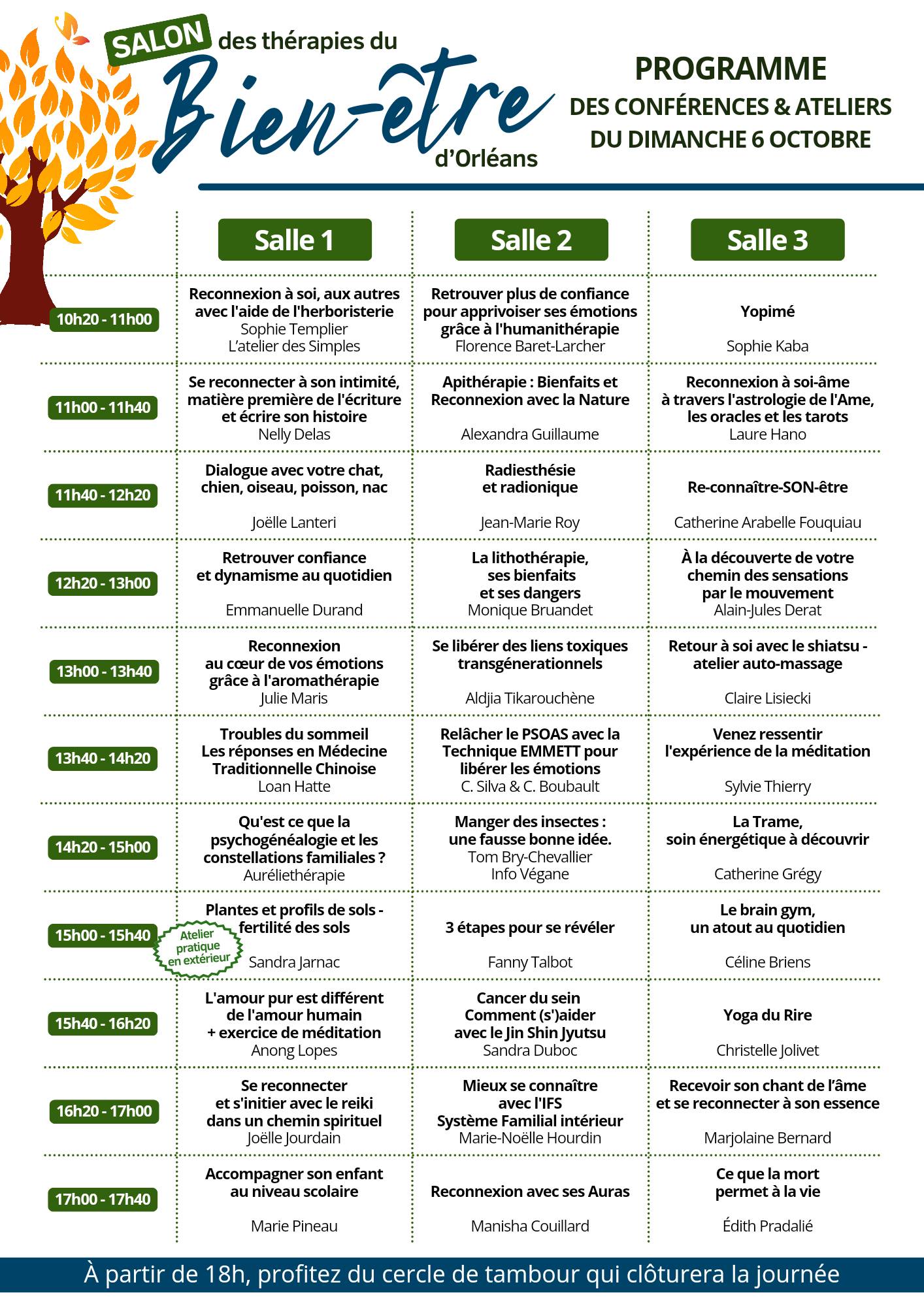 Le programme complet du salon est disponible en cliquant sur le bouton ci-dessous. Si tu veux profiter pleinement de ta journée, je te conseille de jeter un œil aux conférences et ateliers qui t’attirent le plus. Comme ça, tu pourras planifier des moments pour découvrir les stands et aussi prendre un temps rien que pour toi.